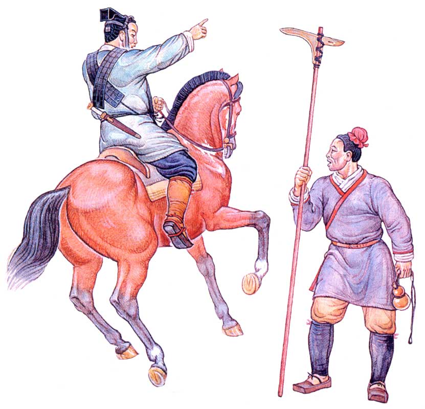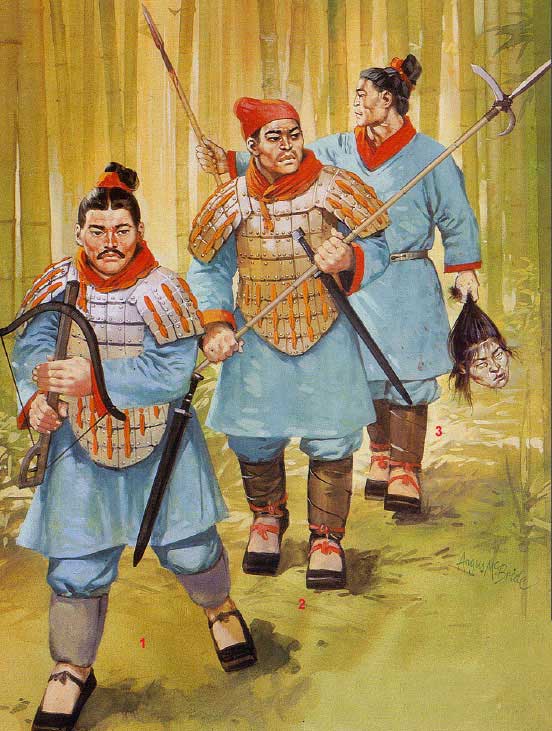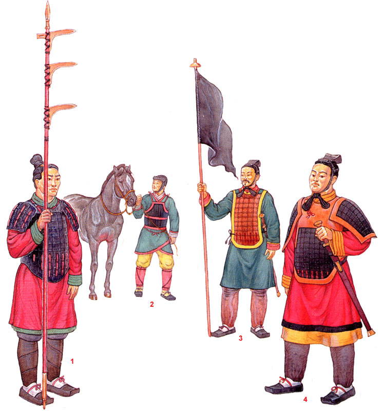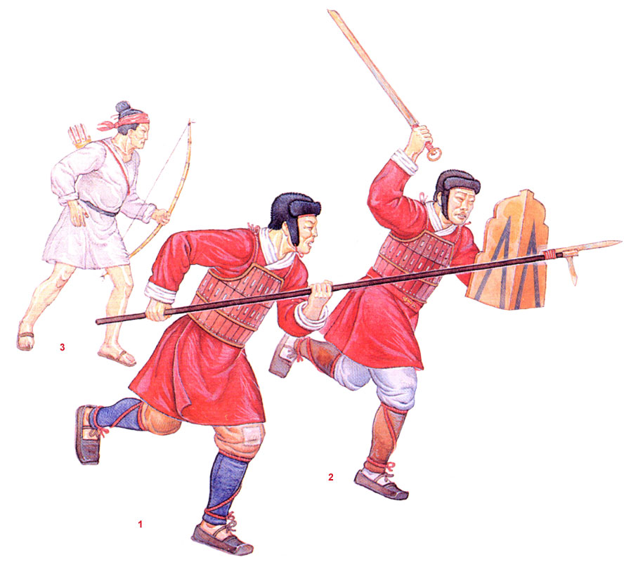 Вооружение — длинный колюще-режущий клевец «цзи», эффективный при борьбе со всадниками противника; 2 — воин тяжелой пехоты с вооружением для ближнего боя — длинным прямым мечем и железным щитом; 3 — воин легкой пехоты из состава вспомагательных частей, которые формировались из вассальных некитайских народов китайской империи.