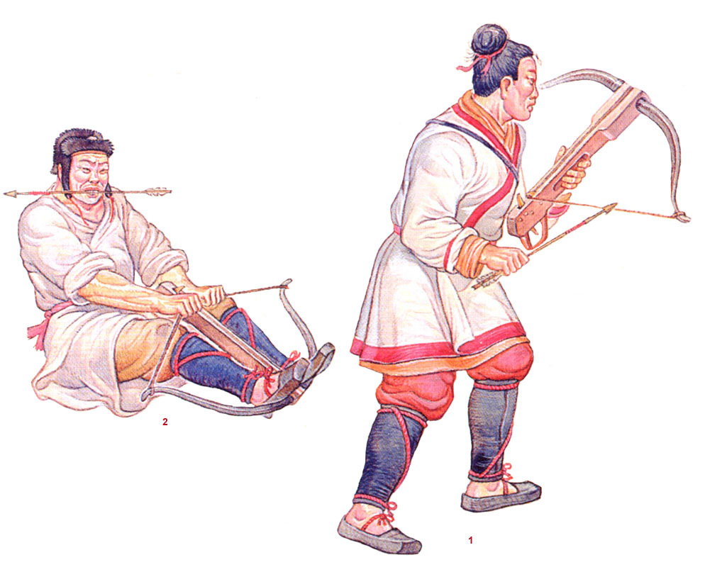 Китайские арбалетчики: 1 — арбалетчик, изготавливающийся к стрельбе.