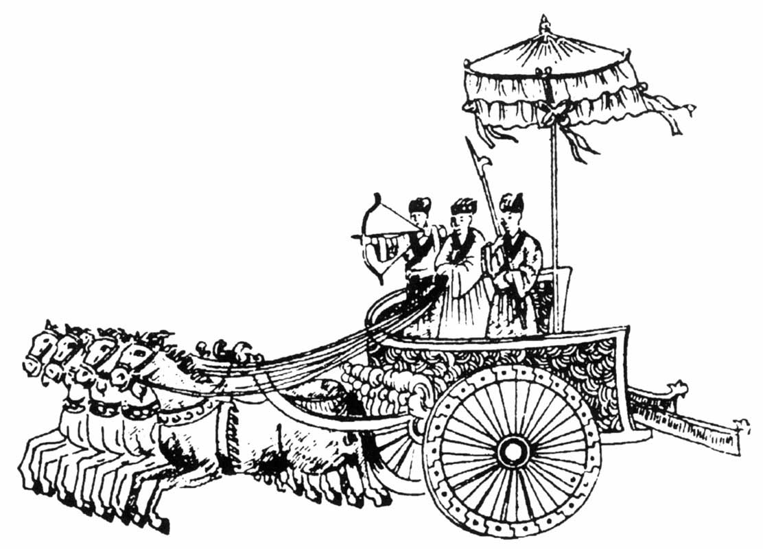 Военная колесница царства Цинь: 1 — возница, у которого латы прикрывали руки, шею и грудь, защищая его от стрел противника. Гибель возницы означала потерю боевой колесницы. 2 — командир, вооруженный луком; 3 — воин, который вооружен клевцом «цзи», использовавшимся в ближнем бою.
