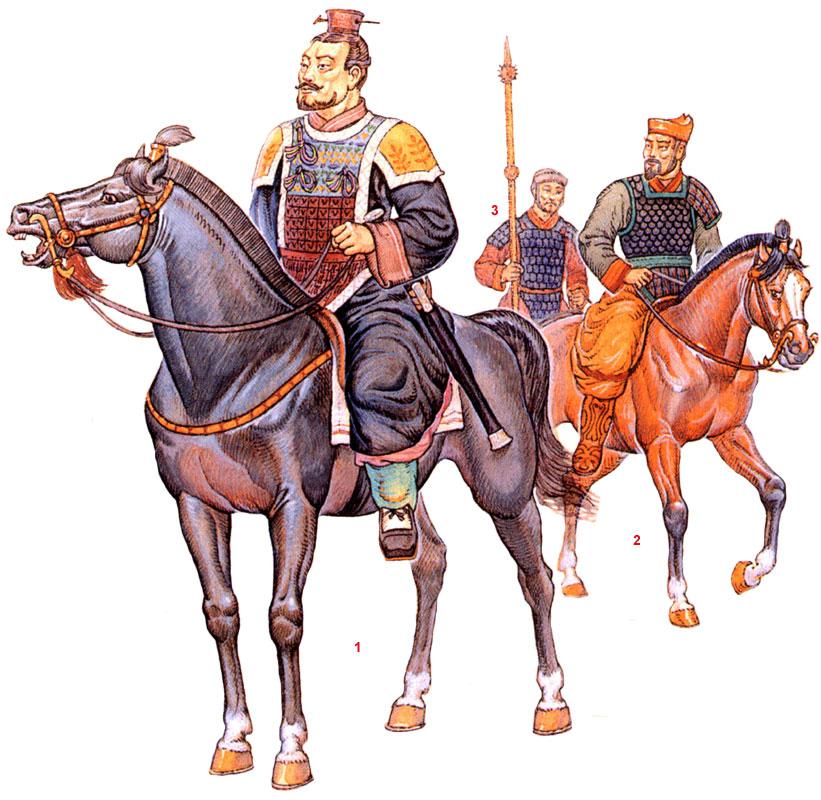 Волосы императора уложены в сложную прическу высшего чиновника империи. 2 — офицер в чешуйчатых доспехах черного цвета и отличительном головном уборе; 3 — конный воин из личной охраны императора в железном панцире, вооруженный длинным копьем.