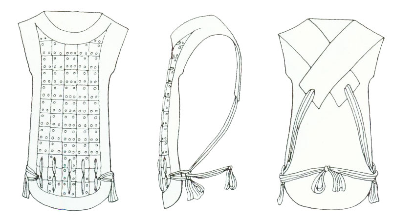 • Пластинчатые панцири имели вид «безрукавки» длиной до бедер, разделенной по высоте обычно на 4-5 рядов пластин прямоугольной или квадратной формы, которые скреплялись между собой при помощи кожаных ремней.