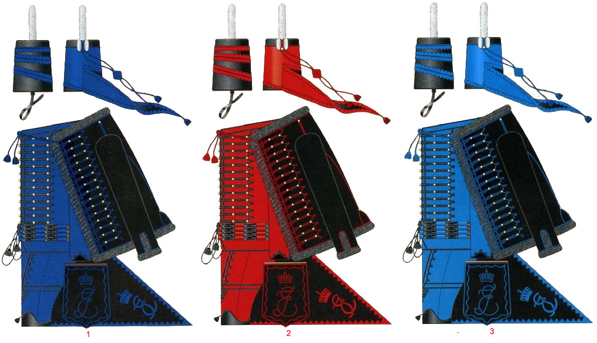 | Ольвиопольский | синий | синий с подбоем из красной каразеи/ черный, белый (офицеры) | красный | черный/ белый/ красный, обшитый белой тесьмой | красный/ желтый | красный | желтый | черные |
