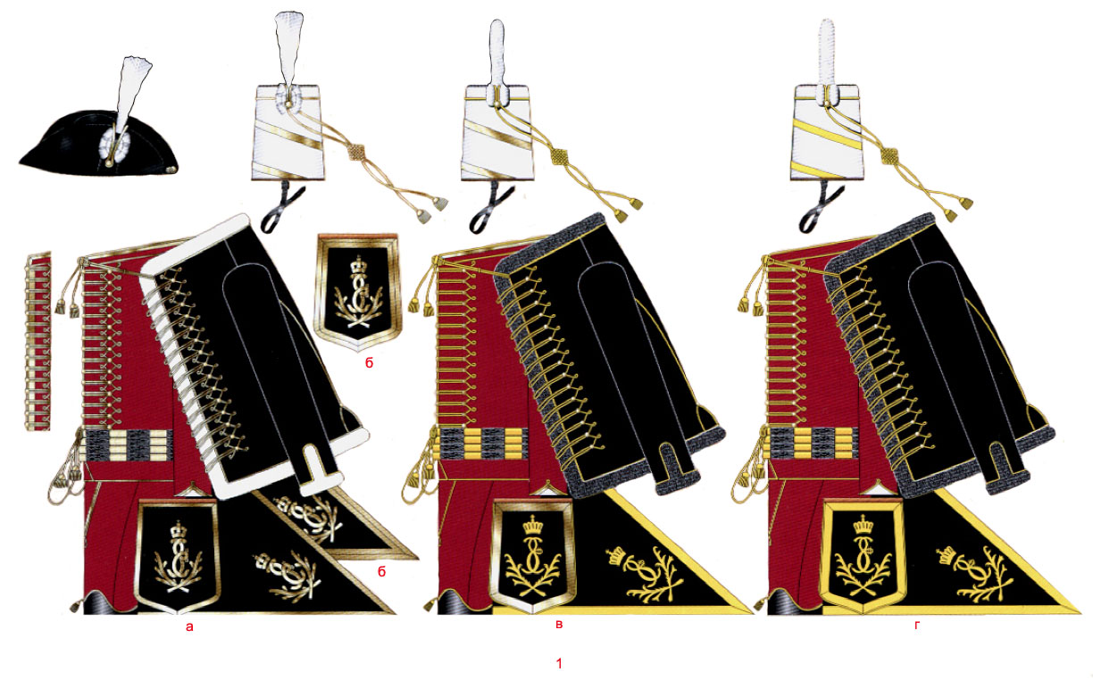 желтый/белый | белый | желтый | белый | черный | черный/желтый | желтый/ черный | черный (на кивере и ташке желтый)/белый | черный |
