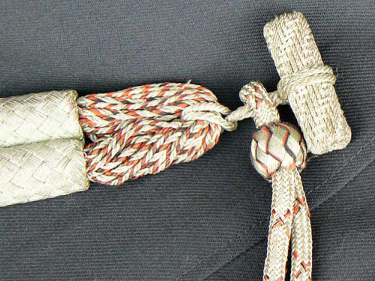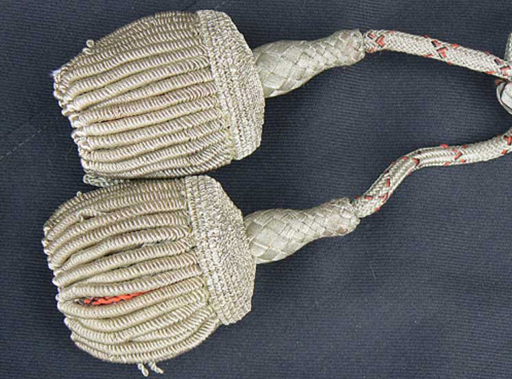 • золотой или серебряный (по цвету пуговиц) галун на ментиках и доломанах — по нижней половине воротника и на рукавах — широкий в 2 см (1/2 вершка) и на груди, за пуговицами — узкий, одной ширины со шнурком;