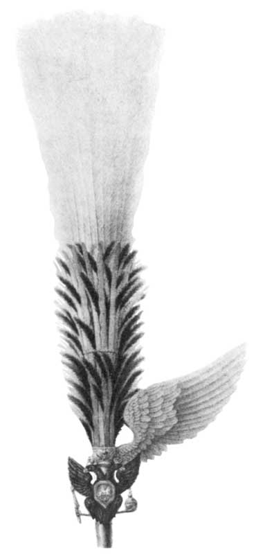 • высокий султан на шляпе из прямых страусиных перьев белого цвета с черными и желтыми петушиными перьями к корню вставлялся в металлическую трубку (челенгу) с двуглавым черным орлом и с золотым орлиным крылом.