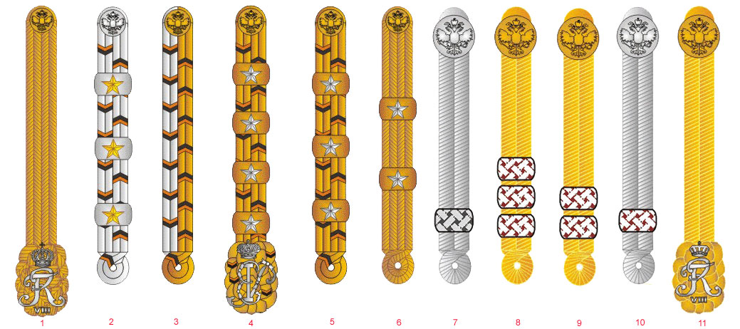 У нижних чинов выпушка оранжевая или белая по прибору, у офицеров — золотого или серебряного шнура по прибору.