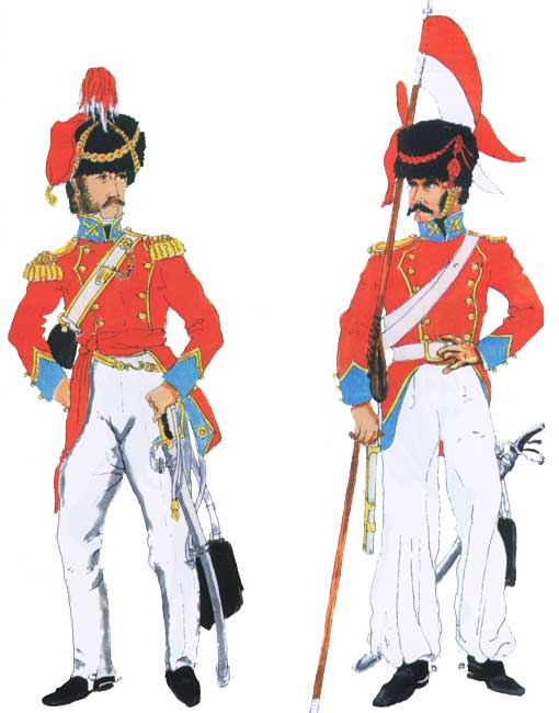 | Сержант-майор (Sargento Mayor) гренадерского полка Каллао (Regimiento granaderos del Callao), 1830 год. Гренадерский конный полк, созданный в 1829 году, относился к линейной кавалерии. Меховая шапка, имевшая кожаное навершье, с национальной кокардой, красно-белыми перьями, оранжевым шлыком и золотыми цепями. |