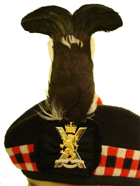 шотландская шапка с бело-красно-черным орнаментом и с перьями в полковой кокарде с левой стороны |